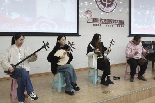 首先,京剧院的老师们向同学们系统介绍了京剧的起源、流派、行当、场面等基本知识,并展示了京胡、小三弦、月琴等京剧常见伴奏乐器。老师们还为大家现场演奏了一段经典旋律,独特的音色瞬间激发了同学们的兴趣,使大家从中感受到戏曲音乐的独特韵味。