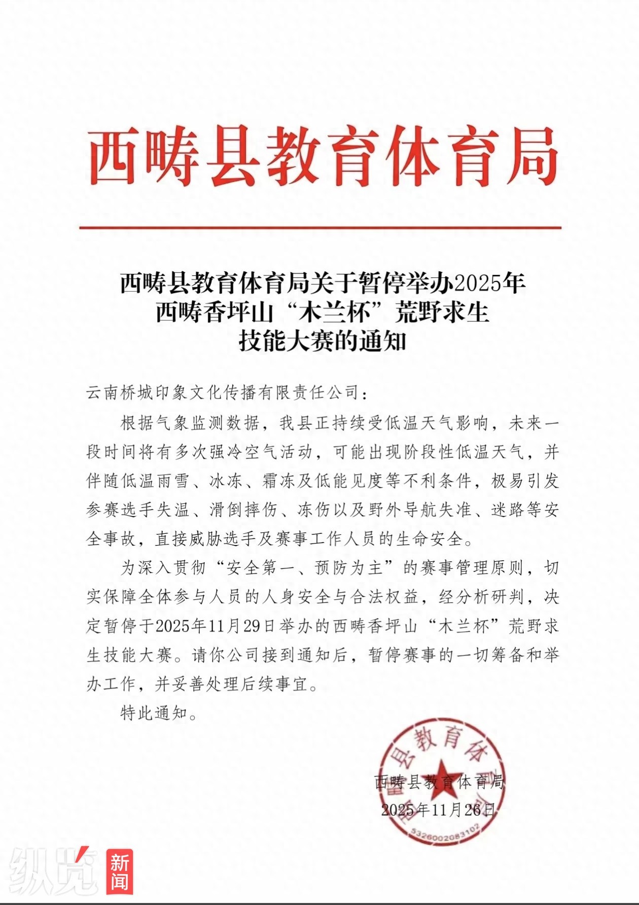 记者看到,西畴县教育体育局发给云南桥城印象文化传播有限责任公司的通知中表示,根据气象监测数据,西畴县正持续受低温天气影响,极易引发安全事故,直接威胁选手及赛事工作人员的生命安全。请相关公司接到通知后,暂停赛事的一切筹备和举办工作,并妥善处理后续事宜。